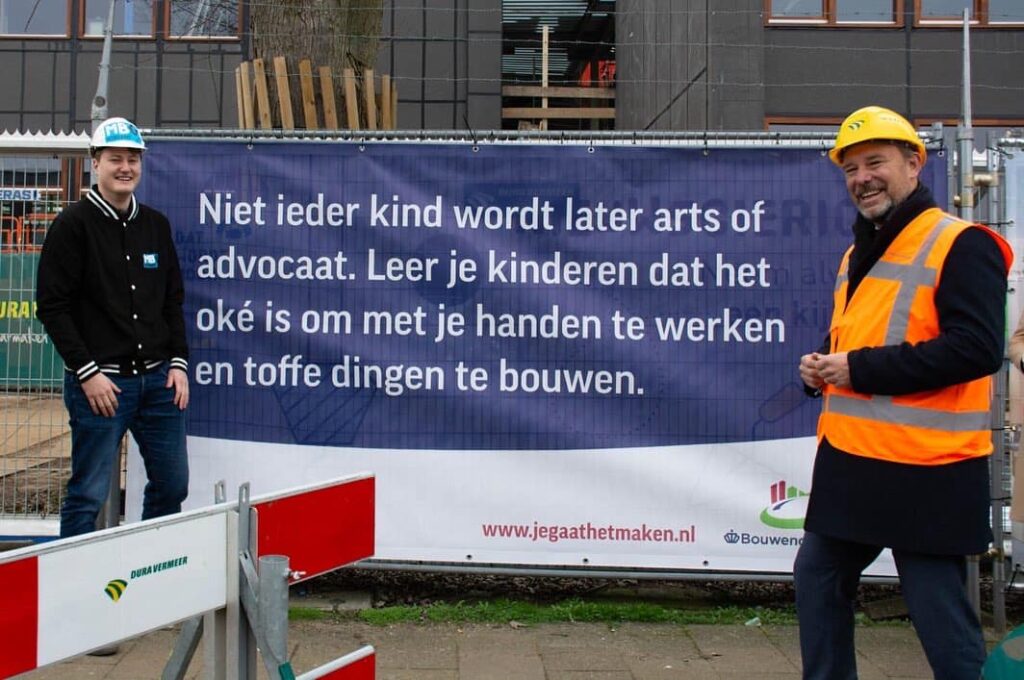 Door het motiveren van jongeren voor een opleiding in de bouw en infra richt Koninklijke Bouwend Nederland – Regio Randstad Noord zich op de toenemende vraag naar arbeidskrachten in de bouw en infra. Er zijn verschillende campagnes om de (zij)instroom te bevorderen. Een daarvan is het bouwhekdoek. Er zijn verschillende varianten waarbij zowel de doeners als denkers onder de jongeren worden aangesproken. Een van die doeken hangt bij MBO Utrecht waar Dura Vermeer Renovatie Midden West momenteel bezig is met een omvangrijke renovatie. De komende jaren wordt er gebouwd aan een bruisend en activerend gebouw, voor studenten en medewerkers van MBO Utrecht in de wijk Kanaleneiland: de nieuwe Onderwijsboulevard van MBO Utrecht.