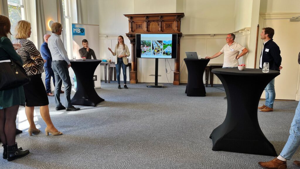 Na de paneldiscussie bracht Dijkgraaf een bezoek aan de Stadstuin. Hier kreeg hij alles te horen over Bizznizz, het onderwijsonderdeel waarbij MBO Utrecht studenten hun eigen startup opstarten. Minister Dijkgraaf maakte kennis met ondernemende studenten van MBO Utrecht. Demi presenteerde haar outdoor dining onderneming Mooi op ’t Hooi, en Wouter vertelde de minister over zijn horecauitzendonderneming Barbeid.