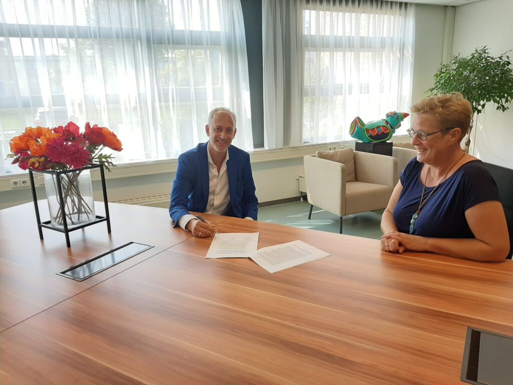 Stichting Warande en MBO Utrecht bezegelden op woensdag 16 september hun intensieve samenwerking in het opleiden van verzorgenden en verpleegkundigen. Annemieke Schuur (manager Mens & Ontwikkeling bij Warande) en Bram Smit (directeur Zorgacademies MBO Utrecht) ondertekenden, op gepaste afstand, de samenwerking voor de komende vijf jaar.